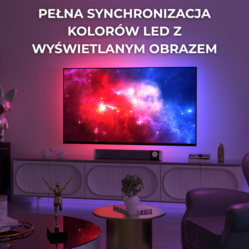 Zestaw wykorzystuje dołączony moduł Sync Box, który w czasie rzeczywistym analizuje sygnał wideo trafiający do Twojego ekranu. Dzięki temu kolory diod LED zmieniają się automatycznie i natychmiastowo, idealnie odwzorowując to, co dzieje się w filmie lub grze, bez opóźnień.
